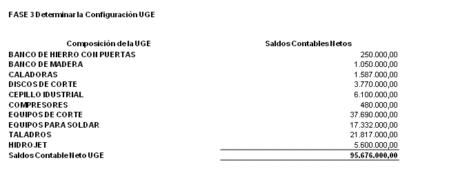 Sobre la base de las proyecciones anteriores, se podrá determinar la configuración de la UGE, luego la composición de la propiedad planta y equipos (PPE) con sus respectivos saldos contables, tal como se puede visualizar a continuación: