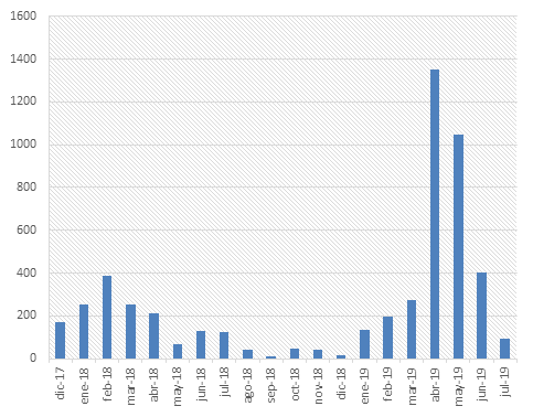 Se proyecta la aplicación sobre modificación de inscripciones por meses: En el mes de abril de 2018 se realizaron 1350 modificaciones de inscripciones, seguido por 1047 en el mes de mayo, resultando un total de 5252 inscripciones entre el mes de diciembre de 2017 y julio de 2019.