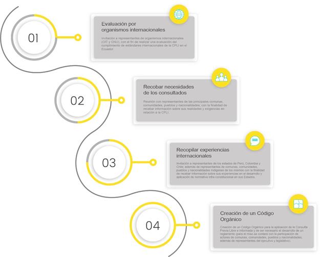 4. Creación de un Código Orgánico para la aplicación de la Consulta Previa Libre e Informada y de ser necesario el desarrollo de un reglamento (para el mismo se contará con la participación de actores de comunas, comunidades, pueblos y nacionalidades indígenas; además de representantes del ejecutivo y legislativo ).
