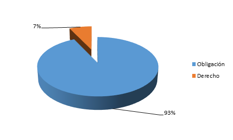 En el caso de la primera pregunta, referente a medir el conocimiento y nivel de percepción que los entendidos en la materia tenían sobre que es la responsabilidad tuitiva en el cuidado de los adolescentes, el 92,9% (ver figura 1) indicaron que es una obligación y un derecho, mientras que, el 7,1% manifestaron que es un derecho.
