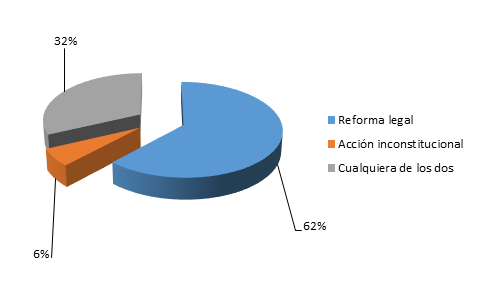 En otra interrogante se planteó cuál sería la solución para que se incorpore la oralidad y el derecho a ser oído en el procedimiento para sancionar las faltas leves en la Policía Nacional del Ecuador, a lo que el 62% refirió que corresponde plantear una reforma legal por intermedio de la Asamblea Nacional, el 6% sostuvo que lo adecuado es presentar una acción de inconstitucionalidad ante la Corte Constitucional y el 33% restante expuso que son viables cualquiera de las dos soluciones; enfatizando que el objetivo del presente trabajo es proponer una reforma legal y con eso coinciden la mayoría de los encuestados (ver figura 2).