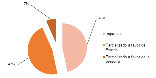 Según los resultados el 100% de la unidad de análisis ha referido que conoce las causas que se han ventilado en la Corte IDH, en contra del Ecuador por la vulneración de derechos humanos por parte del Estado, es importante recalcar que el 46% de la unidad de análisis, considera que la actuación de los jueces en el ámbito interno es imparcial, el 47% refiere que la actuación es parcializada a favor del Estado y el 7% establece que la actuación de los jueces es parcializado a favor de la víctima (figura 4). Esto tiene injerencia en el cumplimiento de los deberes del Estado, al encontrar la actuación de los jueces parcializada a su favor, se estaría frente a un juzgamiento incapaz de coadyuvar al cumplimiento de estos deberes.