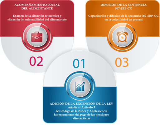 Esta iniciativa se encuentra enfocada a plantear un seguimiento exhaustivo por parte de los trabajadores sociales del Consejo de la Judicatura de las condiciones de vida del alimentante cuando este adolezca doble grado de vulnerabilidad, posea una situación económica precaria y no pueda cubrir su obligación alimentaria. Si el alimentante posee discapacidad, esta tiene que estar regulada a través de un carnet del CONADIS y si sufre de una enfermedad catastrófica esta tiene que ser diagnosticada por un médico que pertenezca al Ministerio de Salud Pública para que proceda la exención del pago, es decir su condición de doble vulnerabilidad debe ser legalmente demostrada y certificada, de manera que el pago de pensiones alimenticias constituya un grave riesgo para su vida debido a la imposibilidad que posee para laborar.