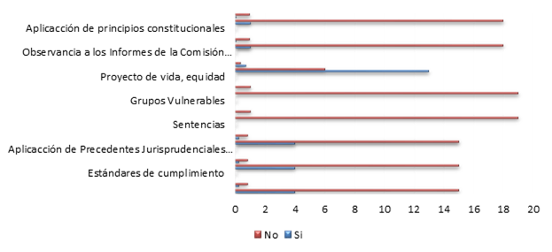 En los resultados se puede observar que los abogados en libre ejercicio de la profesión en la Provincia de El Oro, cantón Machala coinciden en que ni la Constitución mucho menos la Ley Orgánica de Garantías Jurisdiccionales y Control Constitucional han recogido parámetros para establecer una real y ejecutable sentencia de reparación integral, además de que los estándares de cumplimiento en función del objetivo real es nulo, respecto a la debida aplicación de los precedentes jurisprudenciales obligatorios por parte de los jueces es irrisorio; de tal manera que concluyen al 100% que las sentencias emitidas por los operadores de justicia no cumplen con el objetivo de ser las mismas completas, perfectas, integrales, sin demora y ejecutables.