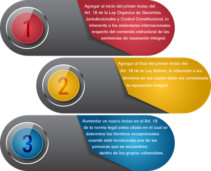 Es por ello que en el presente trabajo se propone realizar modificaciones al artículo 18 de la LOGJCC, con el fin de incluir estándares establecidos en jurisprudencia internacional con la intención de completar dicho concepto y de esta forma generar que la reparación integral logre su fin último, el de restituir el derecho a su estado anterior al daño de forma pronta e integra, y además que los grupos de atención prioritaria tengan una atención preferente cuando su situación de vulnerabilidad ponga en riesgo derechos fundamentales principales y conexos que sean indispensables para la vida y que al ser sujetos de la generalidad de la norma pudieran verse afectados de forma irreparable.
