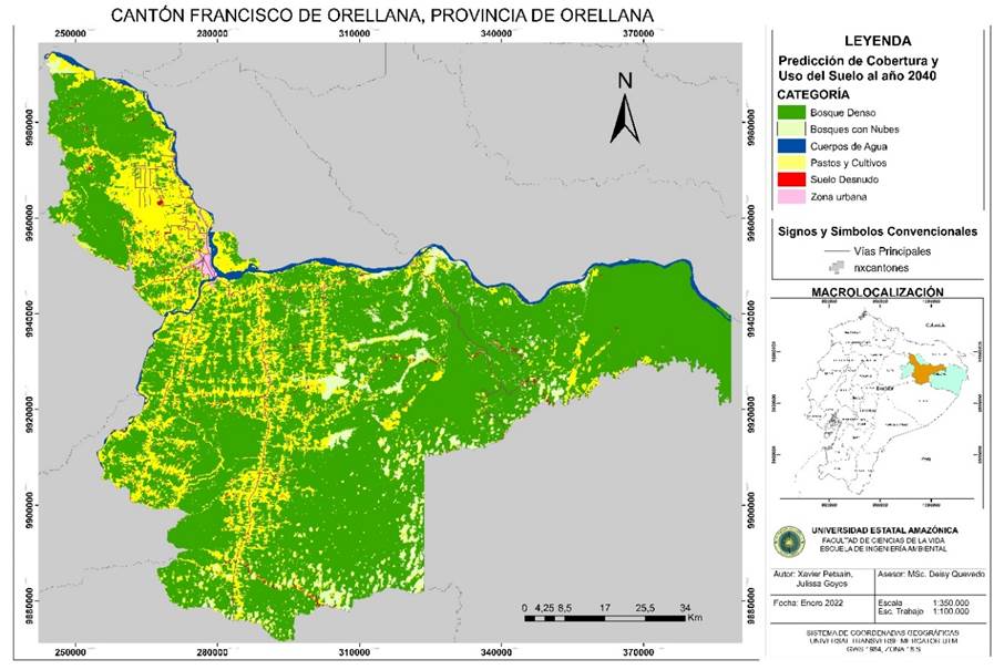 La superficie de Francisco de Orellana experimentó cambios considerables durante el periodo analizado, disminuyendo el área de bosque denso de 625.693,95 hectáreas en 2001 a 577.469,93 hectáreas en 2020. Asimismo, se estableció que los cambios son debido a la expansión de la frontera de pastos y cultivos que se incrementaron a 106 162,40 hectáreas para el año 2020. Se prevé que esta tendencia de cambio continuará hasta el 2040, en mayor proporción para la categoría de pastos y cultivos mismo que se espera un aumento de 143 636,2 hectáreas, esto representa que existirán problemas en cuanto a la biodiversidad, servicios ambientales y sociales, debido a que no se han formulado políticas claras para abordar la distribución adecuada del recurso suelo, aprovechamiento de madera y topografía.