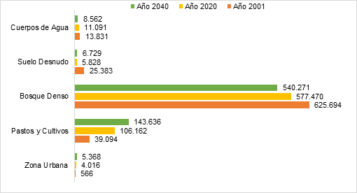 El mosaico de suelo desnudo a zona urbana representó un área de 1 843,8 hectáreas que fueron aprovechados para la expansión poblacional, así mismo, 16 887,7 hectáreas pasaron de suelo desnudo a pastos y cultivos y cerca de 4 108,1 hectáreas pasaron de suelo desnudo a bosque denso, lo que significa que para el 2001 hubo más suelo desnudo y para el año 2020 fueron transformadas a otros usos.