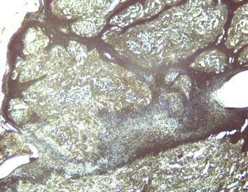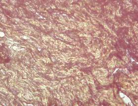 Figura 7. Intercalado con el tejido conjuntivo denso (oscuro) aparecen zonas de tejido conectivo laxo (claro) con escasa cantidad de fibras colágenas. Coloración Tricrómico de Van Gieson 40 X.