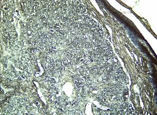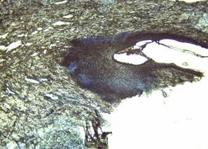 Figura 6. Hiperqueratosis epidérmica y en la dermis se observan numerosos fibroblastos (núcleos azules), fibras colágenas, más abundantes hacia la periferia de la lesión, y fibras elásticas (más delgadas), alrededor de los vasos sanguíneos, todas con tonalidad gris o negra. ColoraciónTricrómico de Van Gieson 4 X.