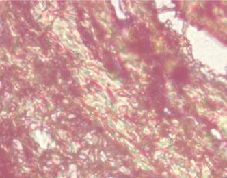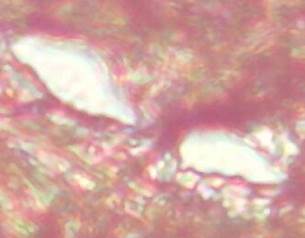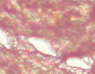 áreas de birrefringencia rojiza, lo que indica presencia de colágeno maduro
