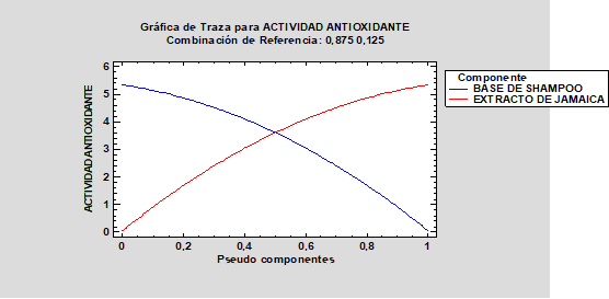 El gráfico de traza (Figura 1) sobre la actividad antioxidante confirma que, al aumentar la proporción de extracto de jamaica, la actividad antioxidante también se incrementa, llegando a un máximo cercano a 6 eq. Trolox/g, mientras que la base de champú muestra una disminución en su actividad antioxidante al incrementar la proporción del extracto. Este hallazgo resalta la función crucial del extracto en la formulación, sugiriendo que su mayor inclusión podría potenciar significativamente las propiedades del producto (Al Badi & Khan, 2014).