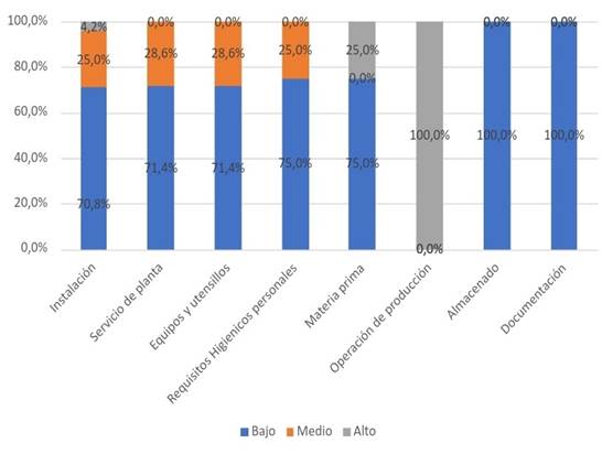 En la figura 1 se observa que las secciones con cumplimiento son: operación de producción ya que tiene un 100% en la calificación alto (cumple); y materia prima que se encuentra en el 25% (cumple), debido a que el veterinario no cumple con todos los análisis de inspección post mortem. Mientras, la sección de almacenamiento no cuenta con una cámara de refrigeración para el producto final, lo cual ayudaría a inhibir el desarrollo de microorganismos; el apartado de documentación tampoco tiene un certificado de las BPM; por lo que ambos presentan un déficit de calificación con un 100% en la escala “bajo” (no cumplen).