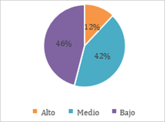 Posteriormente al diagnóstico inicial de las buenas prácticas de manufactura en el matadero municipal del cantón Bolívar, se analizaron los criterios evaluados en la lista de verificación que fueron expuestos en la fase anterior (Figura 2), notándose que se incrementó al 12% en la denominación alto (cumple), a un 42% en medio, con un alto margen de mejoras, y finalmente una reducción al 46% en lo denominado bajo (no cumple).