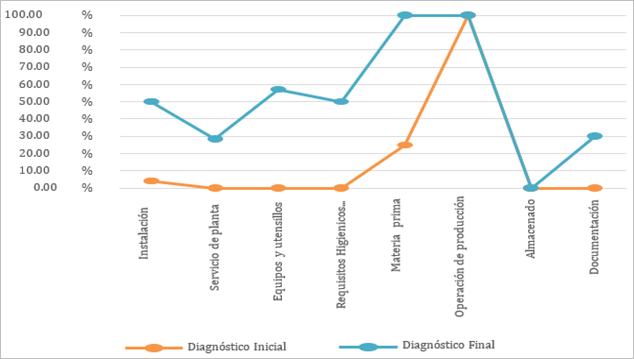 Figura 3. Comparación del cumplimiento de las BPM del diagnóstico inicial y final.