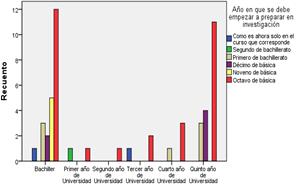 Tanto los bachilleres como los docentes, según lo que muestra la figura 3, coinciden en que se debe empezar a enseñar investigación desde el Octavo año de Educación Básica; pero, incluir una nueva asignatura a la malla curricular implica un proceso sumamente complejo, por lo que se debe buscar una manera más viable para hacerlo. Además se requiere de las correspondientes autorizaciones de los organismos competentes, a nivel de Ministerio de Educación.