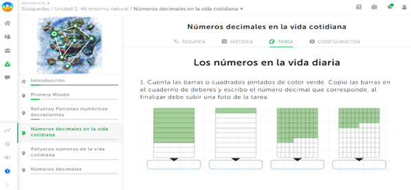 Es aquí, donde cada estudiante percibe gran contenido de valor con respecto a su aprendizaje en las operaciones elementales, conforme su dedicación, su esfuerzo y perseverancia, la plataforma asigna bonos, monedas, o experiencia. Además, cuando sus participantes envían las tareas antes de la fecha asignada, los círculos verdes comprenden las misiones, al ingresar en la primera de ellas, se despliega un saludo de bienvenida, y explica de manera breve su funcionalidad. A su vez, las misiones se desbloquean de manera automática cada vez que el estudiante complete un reto, podrá visibilizar en su mapa el próximo desafío.