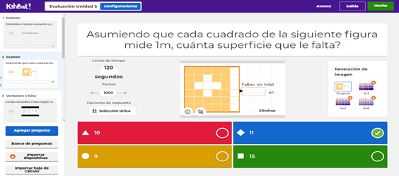 Para la última etapa dentro del Classcraft se elaboró una evaluación en Kahoot sobre la unidad 5, conformadas por interrogantes de verdadero y falso, seleccionando la respuesta correcta, entre otras. Como se ha visto en otras investigaciones al insertar herramientas tecnológicas para medir el aprendizaje sobre algún conocimiento, el estudiante responde mejor ante nuevos entornos, en dependencia sobre la efectividad de la gamificación, la evaluación revela datos con los cuales el docente podrá ajustar algún cambio o mejora en la plataforma de ser requerido.