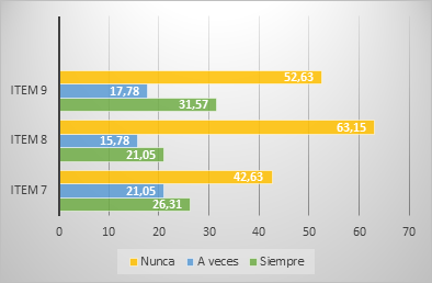 En la dimensión 3: Eje de expresión y comunicación, también se refleja un desuso de los medios audiovisuales. En el ítem 7, el 42,63 % indica que no los emplean para desarrollar la capacidad comunicativa y expresiva de los niños, el 21,05% los usa a veces y el 26,31% siempre. Un porcentaje considerable, el 63,15% del ítem 8, tampoco emplea los medios audiovisuales en los procesos relacionados con el desarrollo de las habilidades motrices, 15,78% lo hace a veces y 21,05% siempre. Finalmente, el 60, 52% nunca los han utilizado como herramienta de expresión artística, el 17,78% a veces y el 31,57 siempre.