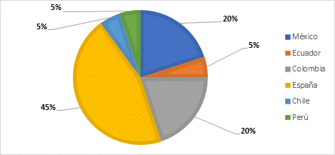 Respecto al contexto geográfico donde se originan los estudios que se sistematizan en la presente revisión (n=20), como muestra la figura 4, cuatro de los estudios incluidos se refieren a investigaciones que se originaron en Colombia para un 20% (Artículos 4, 12, 13, y 19), cuatro en México para un 20% (Artículos 1, 7, 15, y 20), 9 en España para un 45% (Artículos 2, 5, 6, 8, 10, 11, 14, 16, y 18); y tres en otros países como: Ecuador (Artículo 3), Chile (Artículo 9), y Perú (Artículo 17), para un 5% en cada uno. En general predominan los estudios en el contexto de América Latina, donde se localizan 11 de los 20 estudios incluidos.