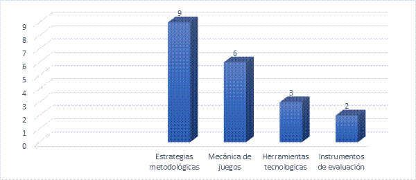 En los 20 artículos que se sistematizan, 9 implementan la gamificación como estrategia metodológica, 6 aplican una mecánica de juegos asociadas a la gamificación, 3 a través del uso de herramientas tecnológicas y 2 como un instrumento de evaluación.