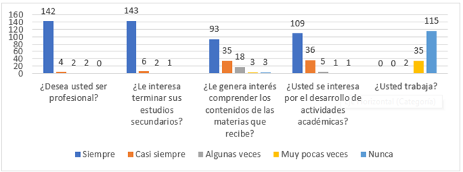 Se constata, que a los estudiantes les interesa culminar sus estudios secundarios (149; 98%), formarse profesionalmente (146, 96%), y prestan atención a sus actividades académicas (145, 95%). Otro aspecto que destacar es que, la mayoría de los encuestados no trabajan (115, 75,6%) y pueden concentrarse en su rol como estudiantes.