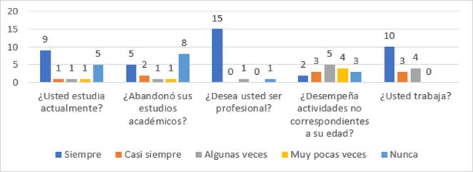 Se evidencia que: 11 (64,7%) se mantiene estudiando, 5 (29,4%) dejaron por completo los estudios, 15 (88,2%) comparten el propósito de ser profesionales. Además, el 29,4% presentan responsabilidades que no corresponden a su edad; y 10 (58,8%) encuestados afirman que trabajan y 7 (41,17%) lo deben hacer regularmente.