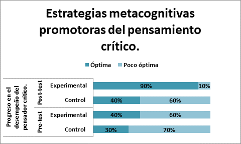 En la figura 2, se observa que, en el pre-test, 30% del grupo control obtuvo un resultado óptimo en la aplicación de estrategias metacognitivas para el desarrollo de su pensamiento crítico, mientras que un 70% mostró un desempeño poco óptimo; asimismo, 40% de los estudiantes pertenecientes al grupo experimental obtuvo un resultado óptimo y 60% poco óptimo. Con relación al post-test, 40% del grupo control obtuvo un avance óptimo, mientras que el 60% obtuvo un avance poco óptimo; por su parte, 90% del grupo experimental logró un progreso óptimo y 10% poco óptimo. Por consiguiente, se pudo corroborar que el grupo experimental también demostró mejor desempeño que el grupo control después del post- test. Este resultado es cónsono con Correa et al. (2019), al aseverar que “la educación, por tanto, debe promover estrategias didácticas y currículos flexibles que posibiliten un proceso formativo que conlleve a aprendizajes significativos, siendo aconsejable potenciar en el aula las habilidades de razonamiento y pensamiento crítico” (p. 62).