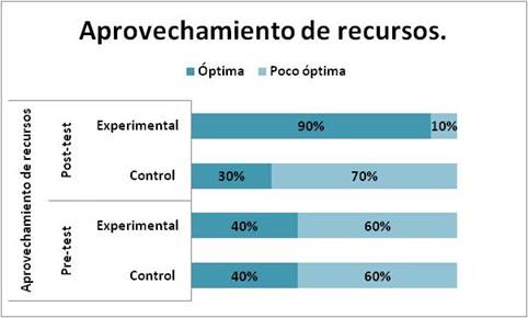 La figura 4 indica que, en el pre-test, 40% del grupo control obtuvo un resultado óptimo en el aprovechamiento de recursos, mientras que un 60% poco óptimo; asimismo, 40% de los estudiantes pertenecientes al grupo experimental obtuvo un resultado óptimo y 60% poco óptimo. Con relación al post-test, sólo un 30% del grupo control obtuvo un avance óptimo, mientras que el 70% obtuvo un avance poco óptimo; por su parte, 90% del grupo experimental logró un progreso óptimo y 10% poco óptimo. Con base en los resultados develados, llama la atención que el grupo control en lugar de mejorar, retrocedió cierto porcentaje, quizás por el uso monótono de los mismos recursos en cada clase. En cuanto al grupo experimental, este sí supo aprovechar los recursos, debido a que emplearon estrategias innovadoras incluyendo las TIC. Klimenko (2009) expresa que “las estrategias cognitivas se encuentran en el plano de la acción, en el plano del hacer. Es un saber hacer, saber proceder con la información, con la tarea y con los elementos del ambiente” (p. 5).