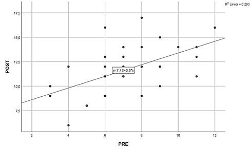 El análisis de regresión lineal revela una relación positiva y significativa entre las calificaciones iniciales y las posteriores a la intervención. Eso sugiere que los estudiantes que obtengan calificaciones aceptables tendrán una tendencia a mejorar su desempeño después de la intervención. Al mismo tiempo, el valor constante positivo del modelo apunta a una mejora general atribuible al programa de aprendizaje cooperativo. Estos hallazgos respaldan la efectividad de la intervención y reflejan una tendencia consistente en los resultados obtenidos.