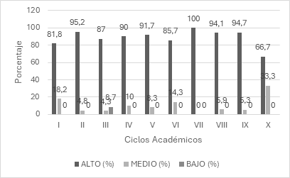 A partir del octavo ciclo, se mantiene una tendencia elevada en la categoría alto (94.1% en el octavo ciclo, 94.7% en el noveno ciclo), pero en el décimo ciclo hay una disminución a 66.7%, con un aumento en la categoría medio (33.3%).