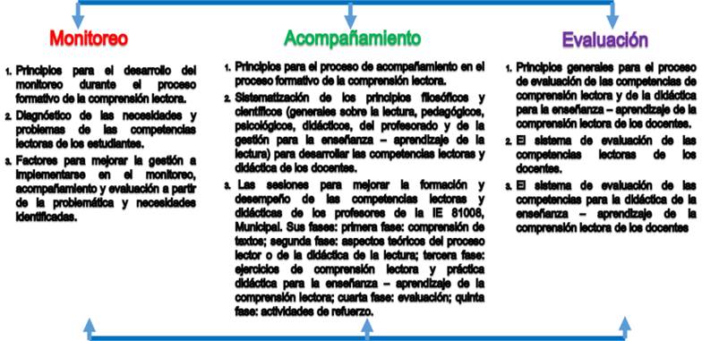 Ese proceso se desarrolló sobre la base de principios de gestión pedagógica sistematizados desde la teoría producida por el MINEDU y la experiencia de la gestión institucional. Asimismo, se sistematizaron los principios filosóficos y científicos (generales sobre la lectura, pedagógicos, psicológicos, didácticos, del profesorado y de la gestión para la enseñanza – aprendizaje de la lectura) en pro de desarrollar las competencias lectoras y la didáctica de los docentes de Primaria.