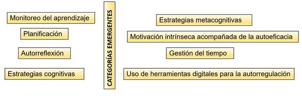Es propicio mencionar que las categorías emergentes, se vinculan con la planificación personal, el monitoreo de los avances adquiridos y la reflexión de las acciones ejecutadas. En esta línea, el trabajo de Shahi et al. (2024) resalta que el monitoreo en el desempeño conductual se orienta hacia el logro de una autorregulación significativa.