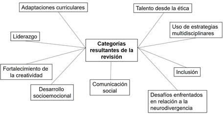 Los resultados del estudio son presentados según las revisiones llevadas a cabo sobre cada una de las investigaciones seleccionadas en base al método PRISMA y a los criterios antes especificados. Cabe destacar que cada categoría resultante de la indagación es detallada por medios de figuras que sintetizan la esencia que cada autor aporta a este devenir investigativo en torno al tema abordado. A continuación, se precisan aspectos, tales como: el talento desde la ética, el uso de estrategias multidisciplinares, la inclusión, los desafíos enfrentados en relación con la neurodivergencia, la comunicación social, el desarrollo socioemocional, el fortalecimiento de la creatividad, el liderazgo y las adaptaciones curriculares. La figura 3 especifica cada uno de estos elementos emergidos de las revisiones y análisis.