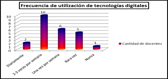 Los resultados de la encuesta aplicada a los 24 docentes del plantel confirman la existencia de una Brecha Digital de Acceso (BDA) marcada, coincidiendo con los diagnósticos regionales (Arion et al., 2024). Respecto a la conectividad, solo el 33% (8 docentes) reportó tener una conexión estable en sus hogares, mientras que el 58% (14 docentes) declaró contar con acceso intermitente o limitado exclusivamente a datos móviles. La disponibilidad de dispositivos también es crítica: el 75% (18 docentes) identificó al teléfono inteligente como su herramienta digital principal, y el 67% (16 docentes) afirmó tener un solo dispositivo o ninguno en sus hogares, el cual debe ser compartido con la familia, limitando su uso para la preparación pedagógica. La figura 1 refleja la frecuencia con los 24 docentes del plantel hacen uso de las tecnologías.