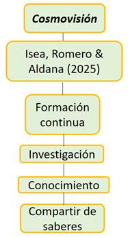 En la figura 2, Isea et al. (2025) sugieren un proceso de formación continua sustentada en la investigación, a fin de contribuir al fomento del conocimiento mediante la socialización de saberes. En el caso de esta investigación, se tomó como norte la iconografía y el tejido Matsigenka como ejes centrales para despertar el interés hacia conocer su simbolización, considerando lo tangible y lo intangible para generar narrativas míticas dentro de un aula de clase acerca del arte.
