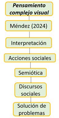 Según la figura 6 el pensamiento visual complejo se basa en la interpretación de signos no alfabéticos, entendiendo el tejido como un sistema que codifica y une las acciones sociales y la mitología por medio de lo semiótico. Méndez (2024) expresa que la influencia de la semiosis social destaca la relevancia de los discursos sociales en los contextos culturales en pro de generar soluciones a los problemas de la realidad.