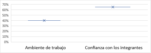 En la figura 3 se puede apreciar la variable satisfacción en el trabajo, la cual es analizada mediante la consulta de percepción que tienen los empleados, tanto del ambiente de trabajo, como del nivel de confianza que existe entre ellos, el resultado obtenido de las dos interrogantes se ubicó en un valor de referencia bajo de acuerdo a los indicadores de gestión proporcionados por Cedeño & Sacón (2016), se puede deducir que estos dos puntos consultados tienen relación directa, pues al no existir suficiente confianza con los miembros de la organización, se genera un ambiente de trabajo no propicio, lo que a su vez repercute claramente en el nivel de satisfacción en las labores que realizan, puesto que esto refleja que los empleados están realizando su trabajo por obligación más que por satisfacción y de acuerdo a Robbins (2000) existe una relación estrecha entre un trabajador satisfecho en su ambiente laboral con su productividad, por tal motivo podemos ver que la productividad laboral de la empresa está siendo afecta por esta variable.