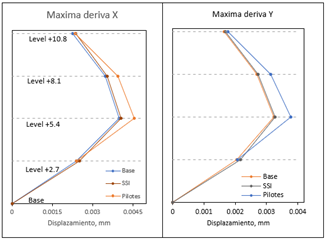 El uso de la estructura de interacción del suelo muestra el aumento del período del suelo en un 3,3% y el uso de pilotes en un 5,4% (Figura 6). Las derivas, por otro lado, aumentan, teniendo en cuenta la interacción suelo-estructura en un 2%, y trabajando con pilotes en un 14% en la dirección x (Figura 7). Las derivas en la dirección y aumentan un 1,3% si se tiene en cuenta la interacción suelo-estructura y un 16% cuando se utilizan pilotes (Figura 7).