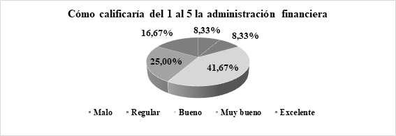 De igual forma se debe de tomar en cuenta que la administración financiera es una de las áreas tradicionales que comprenden un proceso de gestión y gerencia de cada organización indistintamente de su tamaño o del sector al que pertenezca dicha empresa conforme lo manifiestan (Cabrera & Fuentes, 2017) en su análisis de la gestión financiera y que a su vez esta afirmación se relaciona con lo mencionado en el gráfico número cinco, del presente trabajo, mismo que hace referencia a la distribución del dinero al personal de la empresa, con un 58,33% de los encuestados que manifestaron que se debe tomar en cuenta los procesos necesarios para llevar el uso del dinero correctamente y una buena toma de decisiones como lo señala el autor (Huacchilo, 2019), en su artículo científico titulado. “La gestión financiera y su incidencia en la toma de decisiones financieras”