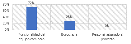 El 72% de los encuestados establecen que de los factores citados la funcionalidad del equipo caminero siempre es determinante para el avance de la Obra; el 28% considera que se debe a los trámites necesarios para poner en marcha el proyecto; mientras que el personal asignado al proyecto no se percibe como una problemática.