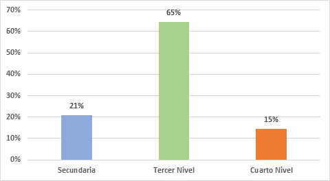 En el gráfico 2, en cuanto al nivel de formación se puede evidenciar que el 64,5% (40/62) de los colaboradores tienen estudios de tercer nivel; mientras que el 21% (13/62) cuenta únicamente con los estudios secundarios y el 14,5% (9/19) posee estudios de cuarto nivel o posgrado.