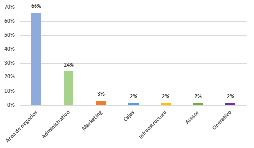 En este estudio se destacó que la mayoría de los trabajadores de la institución financiera, se concentran en el área de negocios. En un informe emitido por la Cooperativa de Ahorro y Crédito de los Servidores Públicos del Ministerio de Educación y Cultura, se especifica que el 23% pertenece al área de negocios, incluyendo asesores, asistentes, coordinadores y analistas, siendo uno de los departamentos de mayor exigencia para el cumplimiento de los objetivos organizacionales (Cooperativa de Ahorro y Crédito de los Servidores Públicos del Ministerio de Educación y Cultura, 2018).