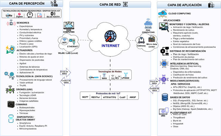 La Capa de Red facilita el envío y procesamiento de datos capturados mediante tecnologías de comunicación como WiFi, Ethernet, LoRaWAN, 4G, 5G, LPWAN y WAN, posibilitando la transmisión de información a centros de procesamiento locales o remotos (Edge Computing) para procesar los datos cerca del lugar donde se generan, computación en niebla (Fog Computing) a través de microcentros de datos (micro data centers) para análisis intermedio, o computación en la nube (Cloud Computing) para tareas más complejas y almacenamiento masivo (Mazon Olivo y Pan, 2022; Singh et al., 2021). La interoperabilidad de dispositivos se logra con protocolos IoT como MQTT, CoAP, HTTP/HTTPS, AMQP y RESTful, que habilitan el control y la transferencia segura y eficiente de datos en entornos agrícolas inteligentes (Ghazal et al., 2024; Mazón-Olivo, 2023).