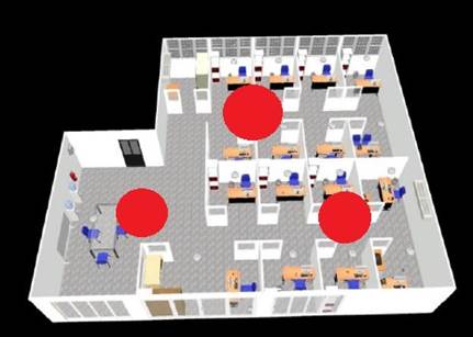 Figura 3. Croquis tridimensional de la sala de profesores con la ubicación de sensores.