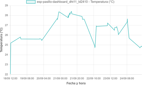 Los DHT11 se ubicaron en “espentrada”, “esp-pasillo-entrada” y “esp-pasillo-dashboard”, zonas con condiciones diferentes por flujo de aire, apertura de puertas y equipos encendidos. Esto permitió obtener un perfil ambiental más representativo para correlacionarlo con el consumo energético.