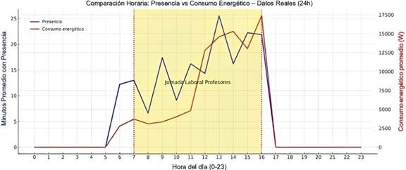 El sistema IoT implementado permitió caracterizar con claridad el comportamiento energético de la sala de profesores, identificando patrones de consumo asociados tanto al horario académico como a prácticas operativas poco eficientes. Estos registros constituyeron una línea base confiable para comprender cómo se distribuye la demanda eléctrica en un espacio real de uso docente.