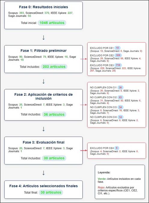 En la Figura 2 se muestra el proceso realizado en el presente mapeo sistemático. En la “fase 0: Resultados iniciales”, se identificaron 1045 artículos en las bases de datos seleccionadas (Scopus, ScienceDirect, IEEE Xplore, SAGE Journals). Posteriormente, estos artículos iniciales fueron sometidos al filtrado de diversas fases, aplicando criterios de inclusión y exclusión, hasta obtener un total de 30 artículos relevantes.