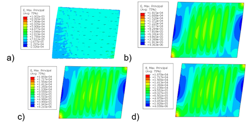 La Figura 7 muestra la distribución de la deformación máxima y mínima principal (E – Máx. Principal, E – Mín. Principal) obtenidas a partir del modelado numérico en ABAQUS para las distintas configuraciones analizadas: (a) sin refuerzo, (b) con refuerzo #10, (c) con refuerzo #12 y (d) con refuerzo #14.
