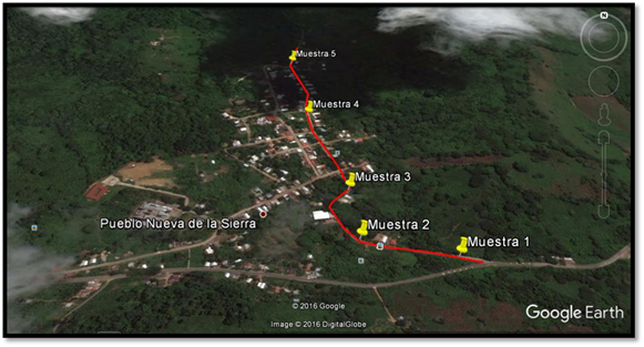 Figura 1. Muestras distribuidas a lo largo del tramo de la vialidad tomada desde Google Earth (2016).