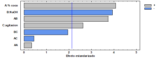 Como puede apreciarse, los efectos estadísticamente significativos corresponden a los factores (A), (B) y (C), así como la interacción (AB).También puede observarse que los efectos de (A), (AB) y (C) son positivos, es decir, incrementan el rendimiento de la reacción; mientras que el efecto de (B) es negativo, indicando que su aumento disminuye la variable de respuesta, esto puede atribuirse a que al estar más concentrada la solución de NaOH, las moléculas del álcali no se distribuyen en la mezcla de la misma forma que cuando la solución está más diluida, por lo que la interacción entre los reactivos para generar el producto se da en menor proporción.